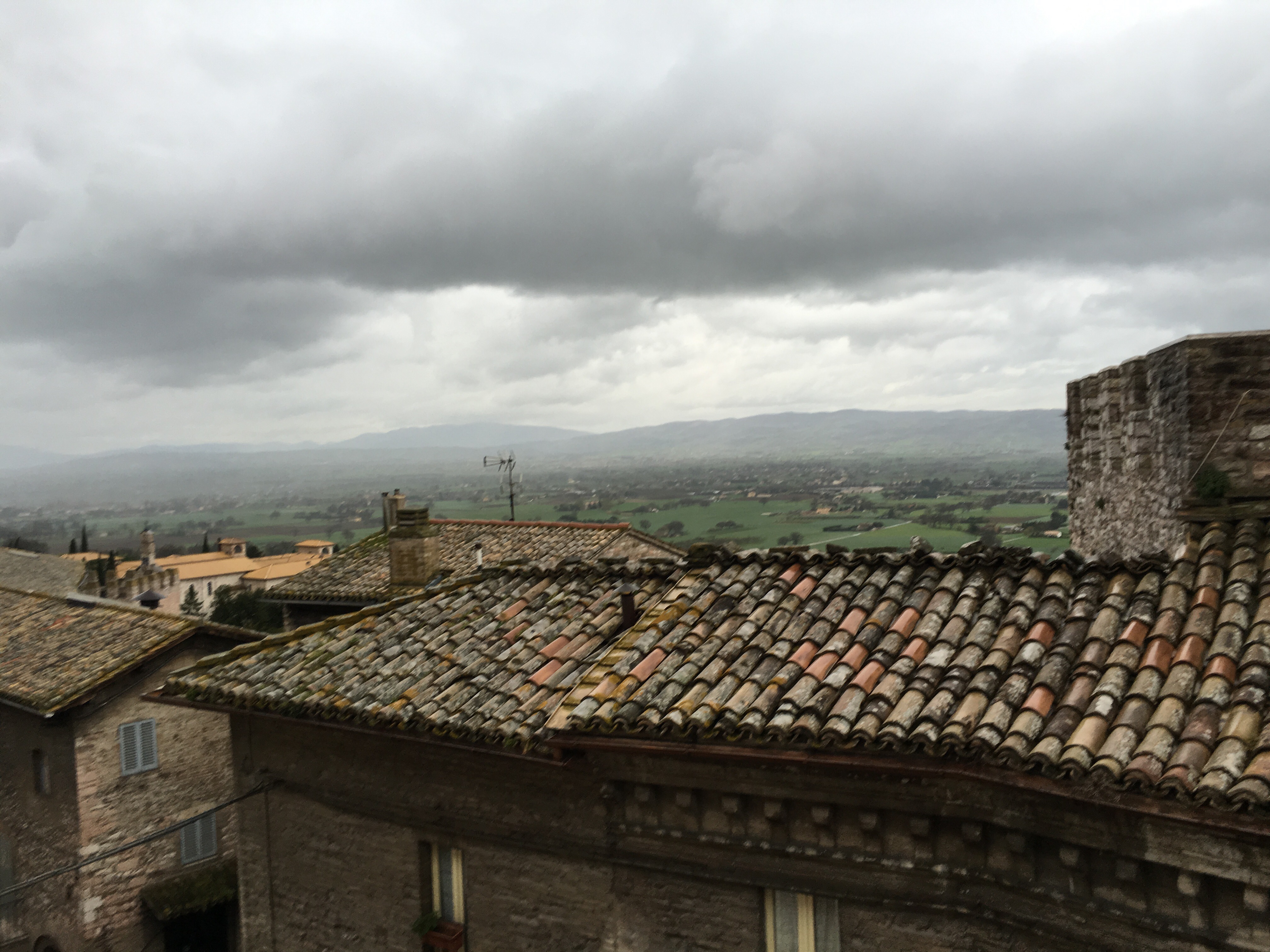 We went back up to the room after breakfast to regroup and get our bags packed. It was pretty wet and rainy in Assisi today, but the view from our hotel was still spectacular!