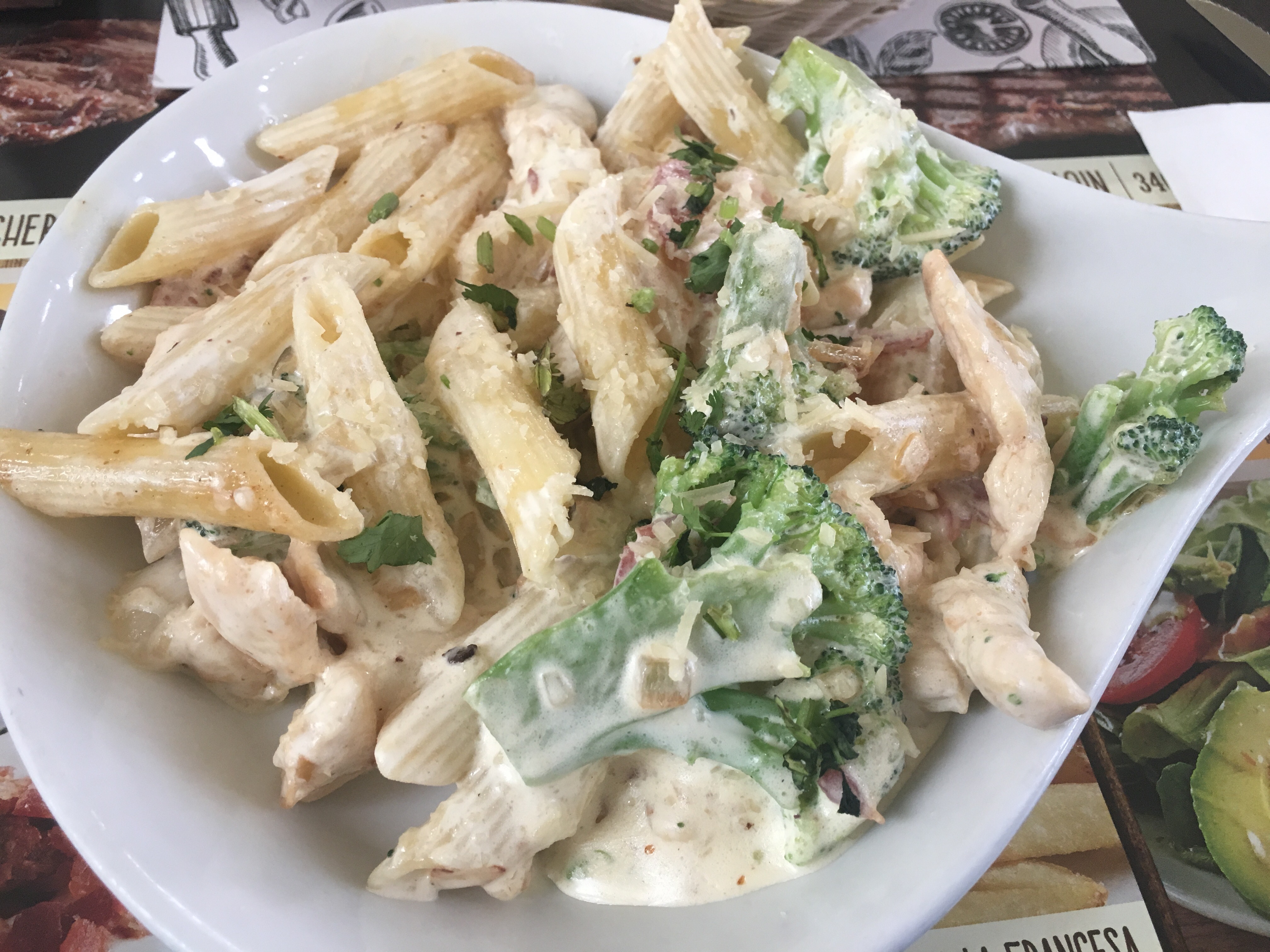 The flight was not nearly as bad as the way into Queretaro and we made it into Mexico City safely. We flew AeroMexico, which is a pretty small airline and so in order to get to the terminal from the plane we had to walk on the tarmac again and then hop on a bus that took us to baggage claim. We ended up having to check our bags that we were planning to carry on, because apparently they can only be 10kg and ours were around 12kg…so we picked up our bags from the baggage claim and then made our way upstairs in the terminal to find some food. We ate lunch at a restaurant in the airport called “Wings.” I had a pasta dish that was one of the chef specialities and it was very good!