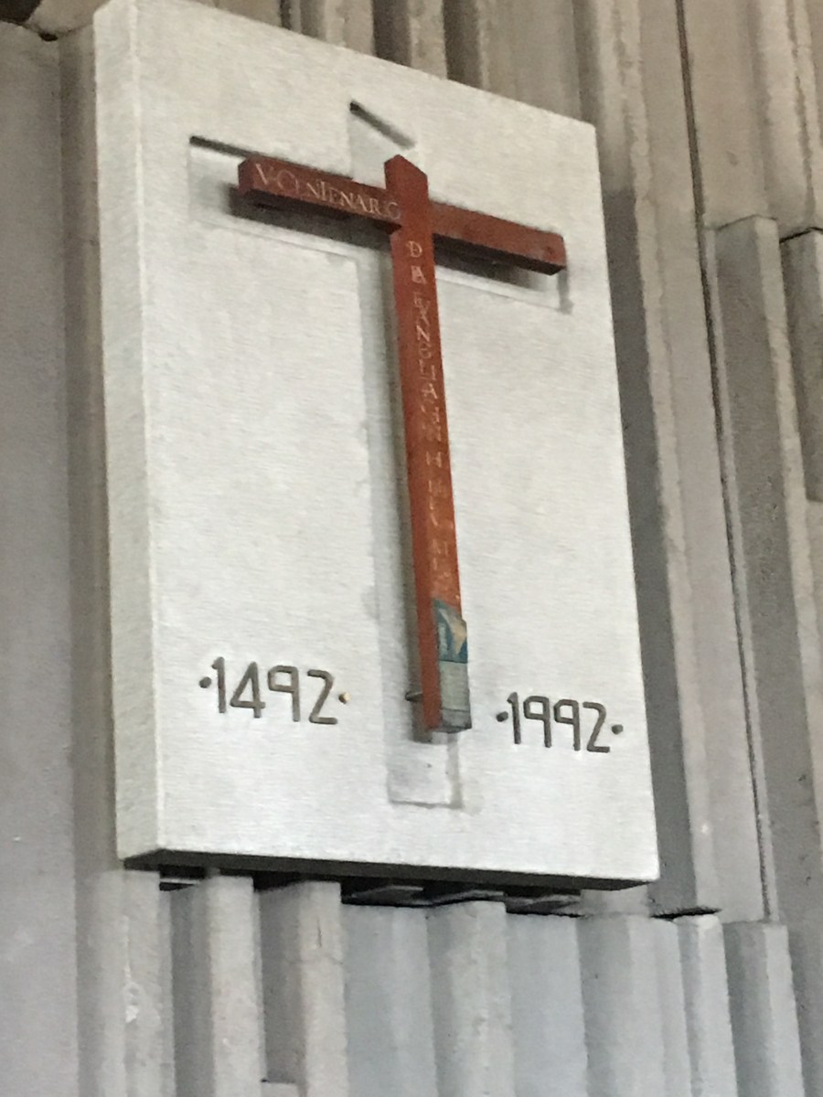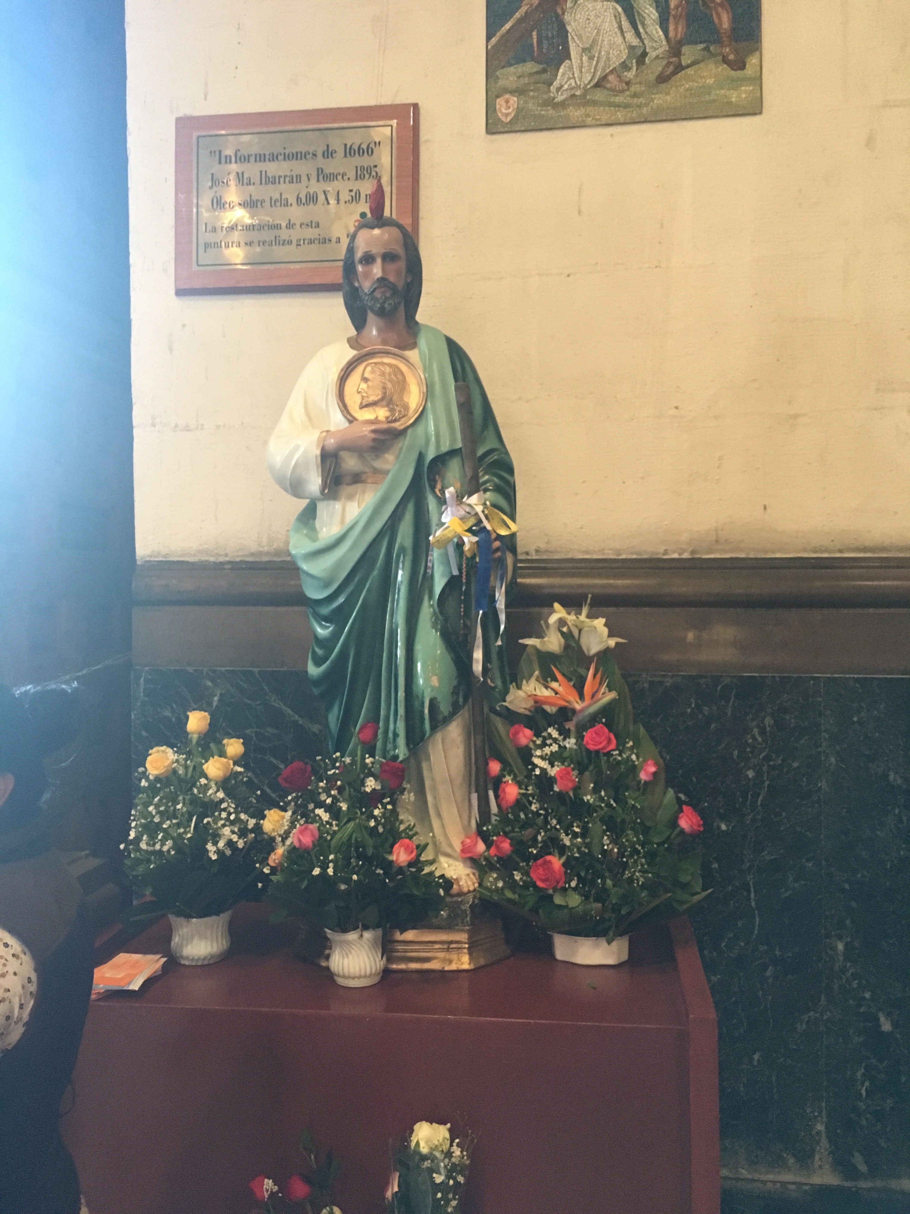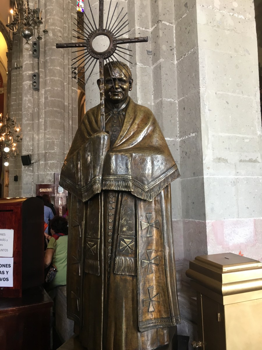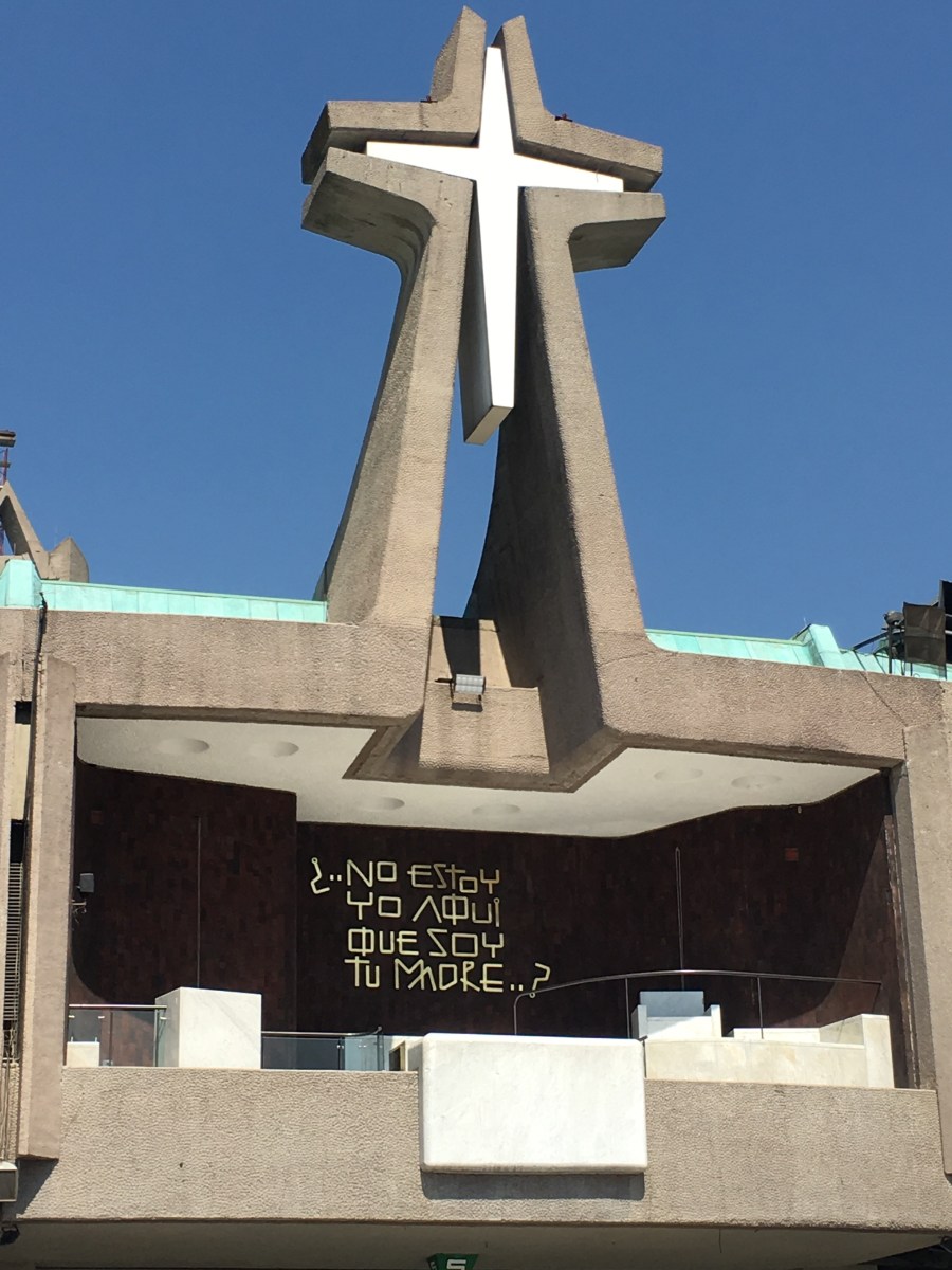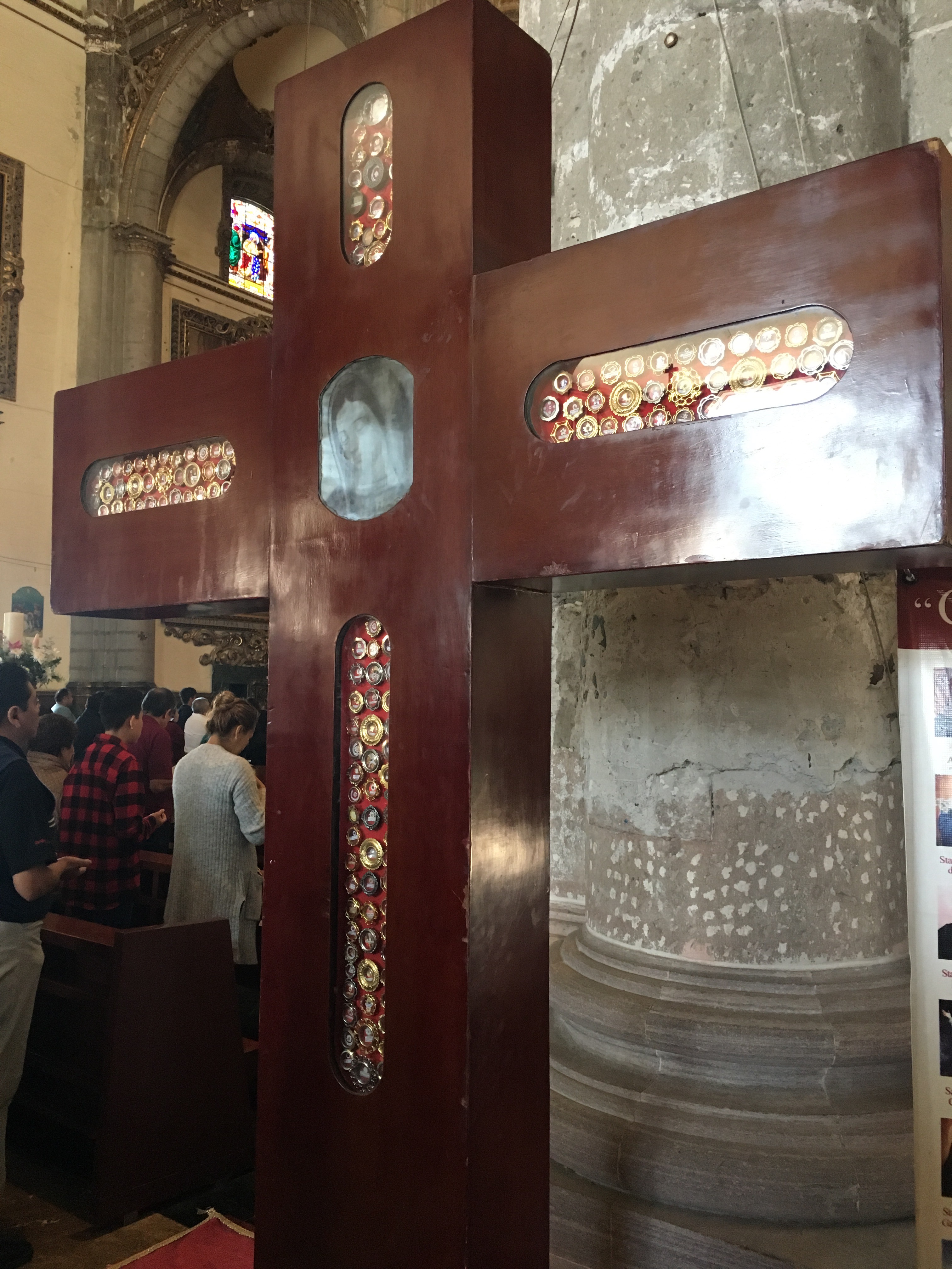 After praying for a while it was time to start making our way back to our pick up location to meet Gerardo. As we walked through the Basilica toward the exit we came across a iron cross that was all bent and deformed. In 1921 an anticlerical terrorist planted a bomb inside of a flower pot and it went off in the Old Basilica. It caused quite a bit of damage to the Basilica itself, but the image of Our Lady was untouched. They keep the cross called “The attempt on Christ” as a reminder of this day and a reminder to all who visit Our Lady to always ask Mary for protection because she will protect those who all upon her intercession!