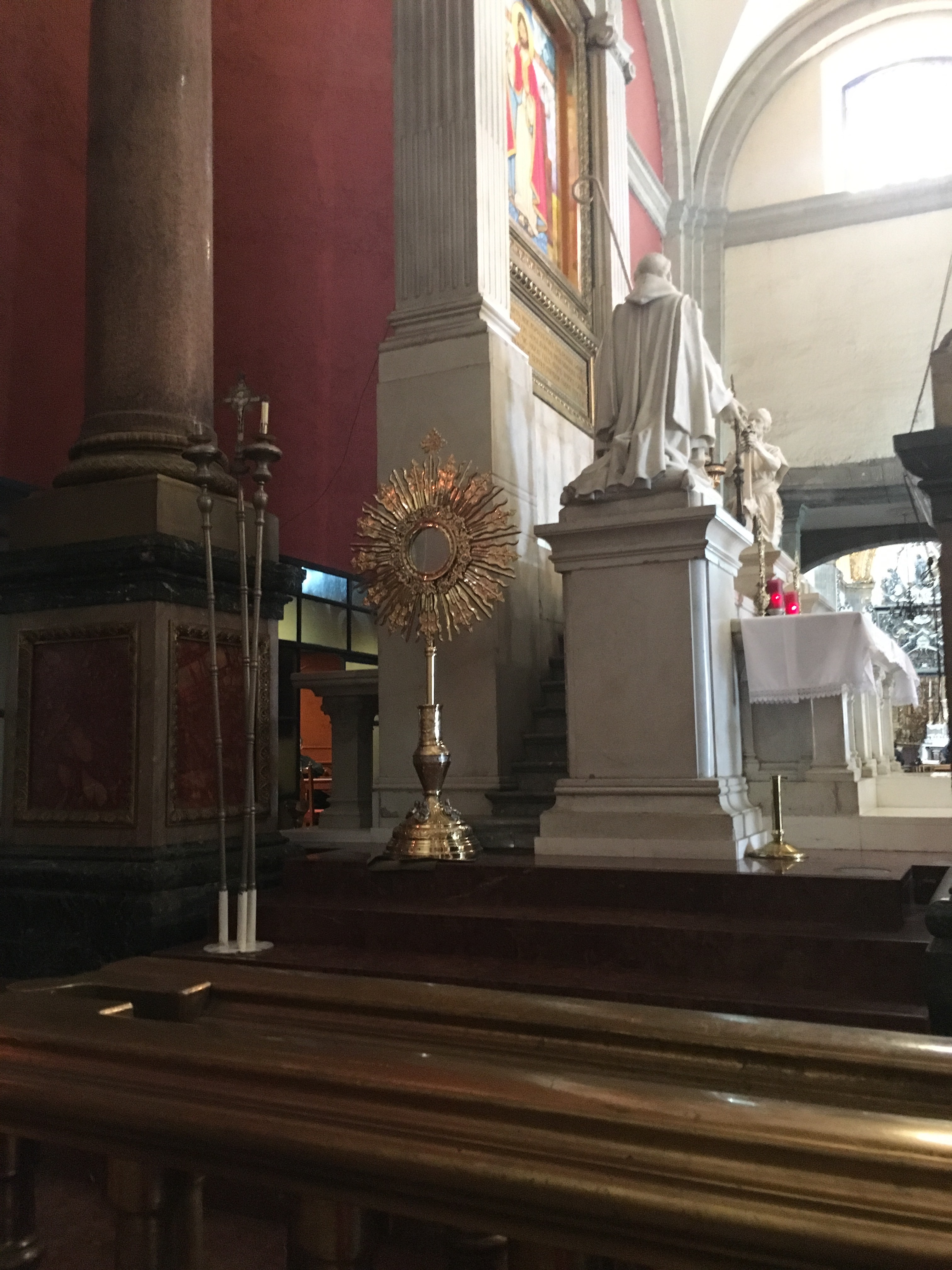 There was Mass going on while we were walking around (I know, shocker right!?) so we just stayed to the sides of the church. As we made our way to the front on the side of the altar there was the monstrance that they use for adoration. It was MASSIVE! I do wish I could have seen the host they consecrate to use for adoration because that would be the BIGGEST Jesus I have ever seen!! I also want to see how they get it up on the altar, because it is definitely not a one person job!
