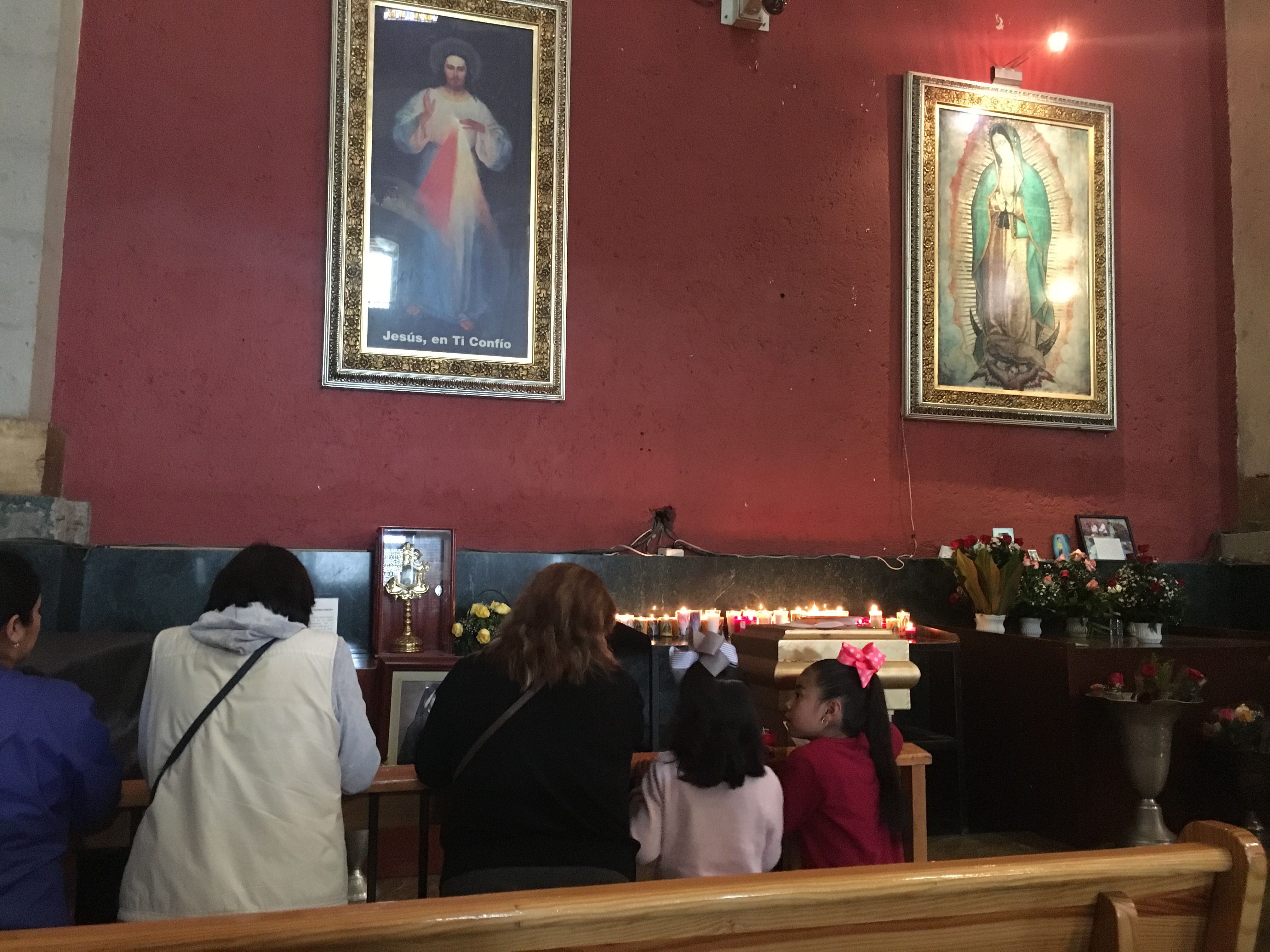 We popped into the gift shop to find a few religious items to remember our trip by. Then we made our way outside to try and make it to the top of Tepeyac Hill to get to the Church of St. Michael, which is the actual site where Juan Diego had the vision of Our Lady and where the image of Our Lady of his Tilma was received. On our way around the outside of the Basilica we came across a priest at a Holy Water don’t who was dousing people and object with Holy Water. So armed with a few of our purchased we made our way over and had our second shower for the day! 😜 It was quite the trek up the mountain, but it was well worth it. You weren’t allowed to take pictures in this church, so I only have one from the outside, but it was very beautiful! We prayed inside for a bit and then made our way back down the mountain.