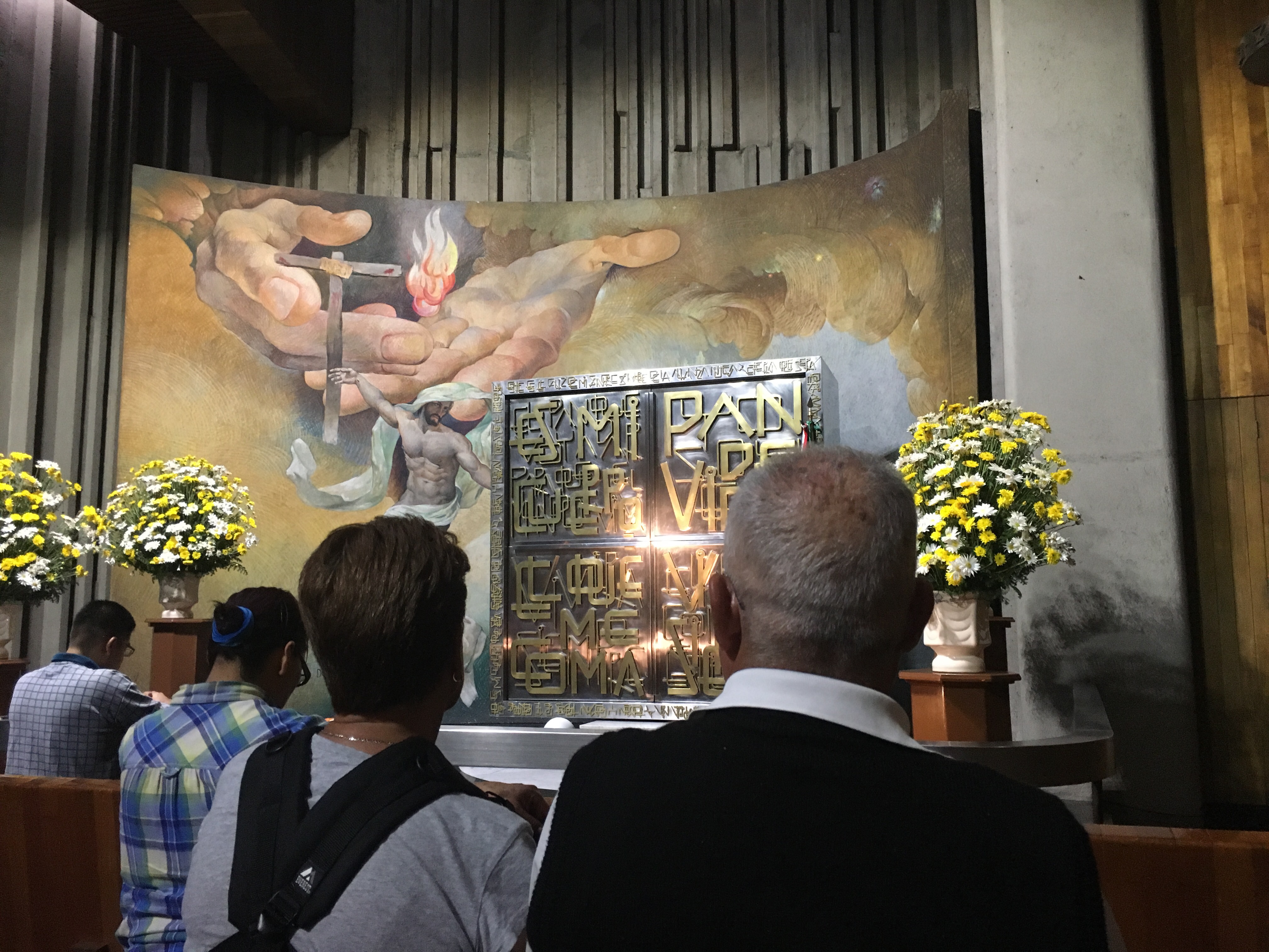 Then we went across the conveyor belts again so we could get to the other side of the Basilica quicker than walking all the way around…and of course to see Our Lady again! 😁 We stopped into the Blessed Sacrament Chapel and prayed for about a half an hour or so. To go along with the massive Monstrance we saw earlier was a Tabernacle that was the size of a small car! I have never seen a tabernacle that big in my entire life, at one point one the workers who helps with the distribution of communion during the Masses came in to get Jesus for the Mass that was going on and he opened the Tabernacle, if you could have seen our faces when we saw how big the Ciboria were it was probably something like this 😲!! SOOO MUCH JESUS!!!!