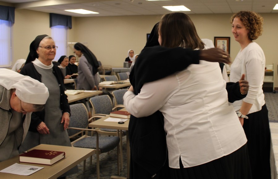 The ceremony consisted of Teresa and I knocking on the door of the Chapter Room (Side note, Teresa is the one who entered with me, so you will likely hear me talk about her a bit.), where we were greeted by the rest of the community and Sr. Pia (the prioress) asked us “What do you seek?” To which we responded “I seek to follow God’s will for my life within this community.” She then escorted us to our seats while the community sang a song. From there she asked us to stand and asked us if we were entering of our own free will and were we willing to live by the statutes of the community and under the direction of Sr. Gabrielle Marie. We answered “I am.” Then she invited us forward where we received our bibles and a copy of the Rule of St. Benedict. Finally we were officially welcomed by the community and every sister came forward to give us a hug and greet us. I don’t think I stopped smiling the entire time.