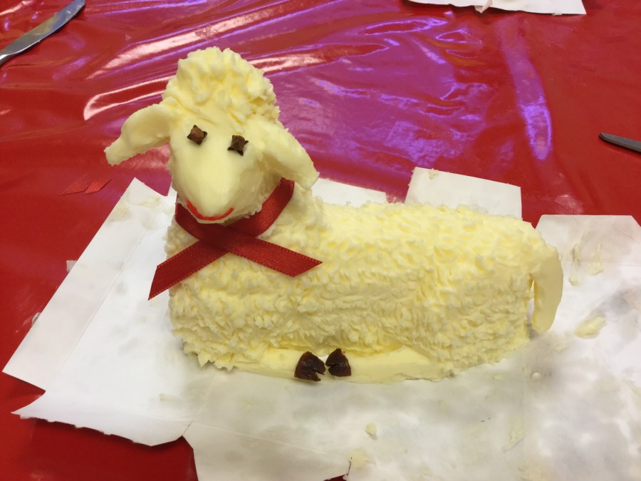 This is Leonard! For those curious, it is made from four sticks of butter. The eyes are cloves, the mouth is red thread, a red ribbon for a bow and raisins for the hooves.