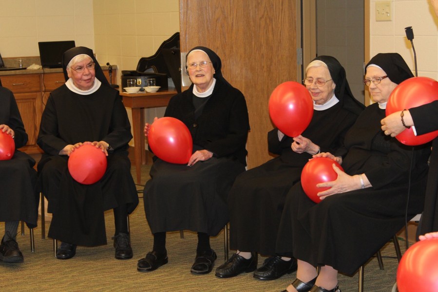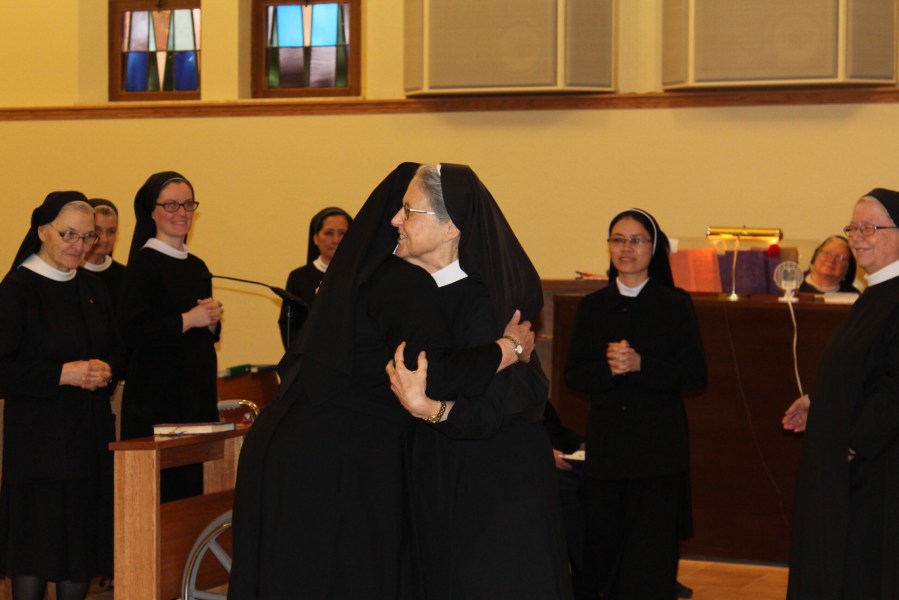 On February 28th we installed our new Prioress of our community! Sr. Rosann, was elected by the community back in November. She is from our Norfolk Priory originally, but had been serving in Africa as superior of one of our houses there for the past ten years! We are very excited to have her back with us and to have her leading our community! The Rite of Installation took place during Vespers (Evening Prayer) where Sr. Pia (our previous Prioress…say that five times fast π) read the Official Document of Election and Authority and led Sr. Rosann in taking the Oath of Office. Sr. Rosann addressed the community briefly and then as a community we stood and pledged our loyalty and support to Sr. Rosann as our spiritual leader. It was a beautiful ceremony! After Vespers and supper we had a program where various groups of sisters had put together short performances to celebrate and perform for Sr. Rosann. The formation group with a few other sisters put on two different performances. First we performed a dance to “The Silly Song” from Snow White. We also performed a dance to a song called “Such a Happy Day.” It was a lot of fun! Below are a few pictures.