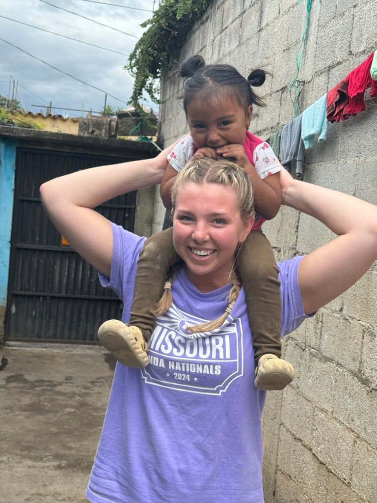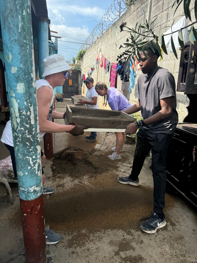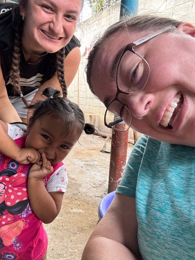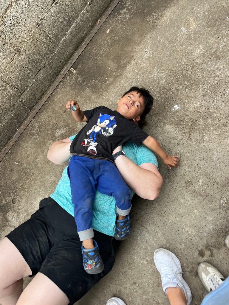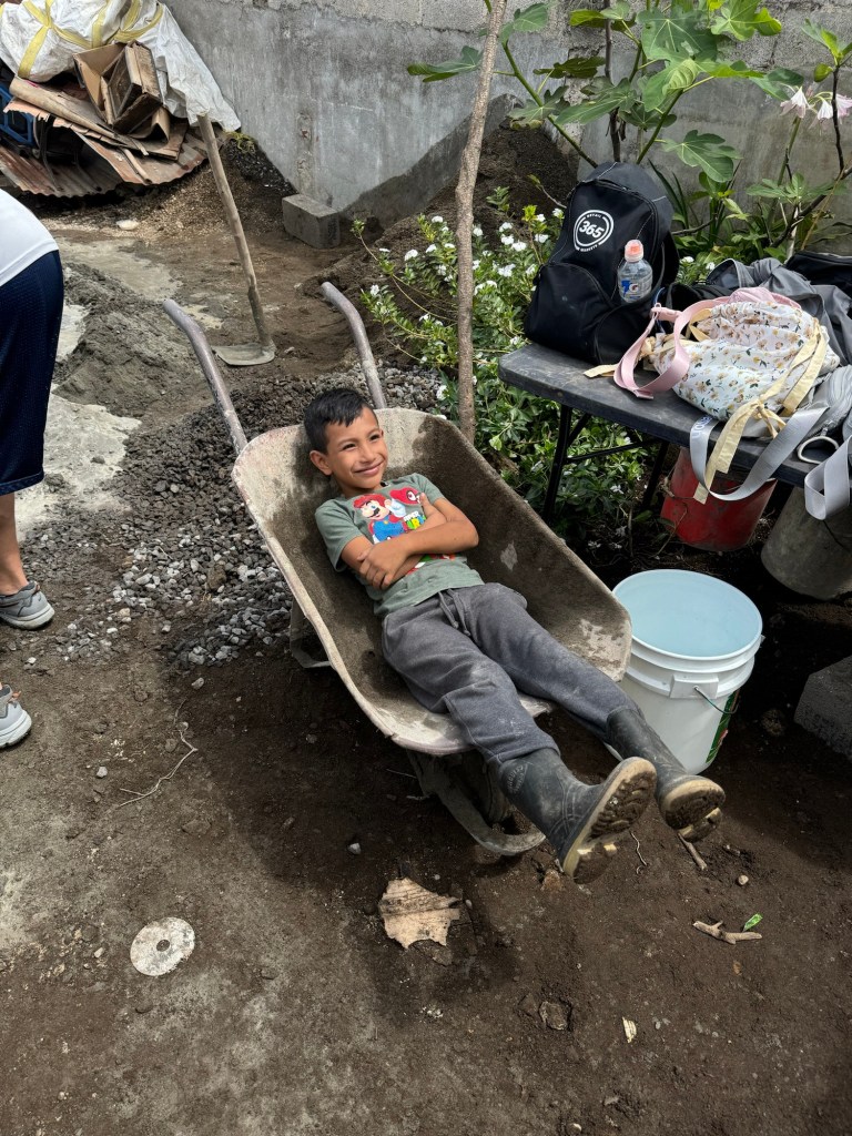After we finished at the tiny house we stopped for some ice cream before walking back to the bus and then headed back to the convent for lunch. Lunch was fried chicken, French fries and salad. We had a few minutes of free time before loading the busses again to head back to Parramos to build stoves for 6 families. The house I was at houses had three families living there (a pretty common occurrence here in Guatemala). A mother and her two (maybe three) adult children all live there. Between the two daughters we counted at least 5 children all under the age of 3, but there might have been a few more that we didn’t see. To start the project there was quite a bit of work for all of us to do, but as we progressed it became that there wasn’t enough work for as large of group as we had today. So while a few of us continued to help build the stove (mainly the men) – the ladies all played with the kids instead. Honestly, the girls may have had the harder work – these two little ones (3 years old cousins) were a bundle of energy and once they realized we could lift them into the air or give them shoulder rides, it was game over. By the end of the afternoon several of us found ourselves being a human jungle gym lying on the floor of the house as they crawled all over us. It was the best day! 🥰