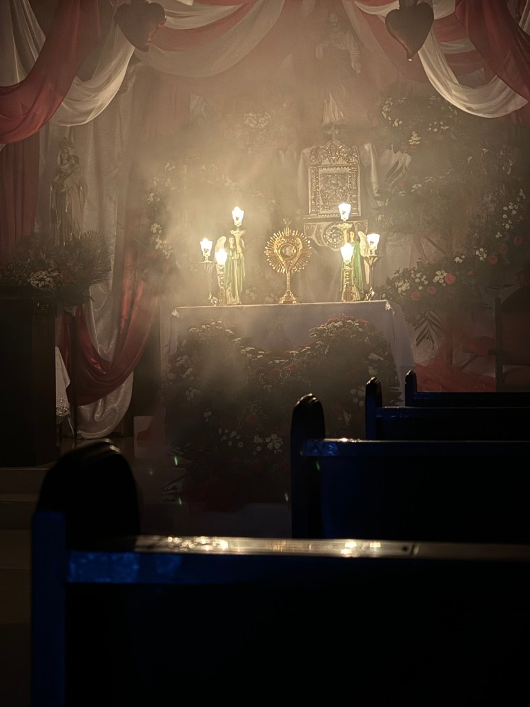 When we got back to the convent I went straight to the shower as I was VERY dusty between the concrete work in the morning and rolling on the floor with the kids in the afternoon. We then had adoration. The power went out in the middle of adoration and the chapel looked so cool! The sisters had the incense FLOWING and all of the smoke with the candle light was awesome!