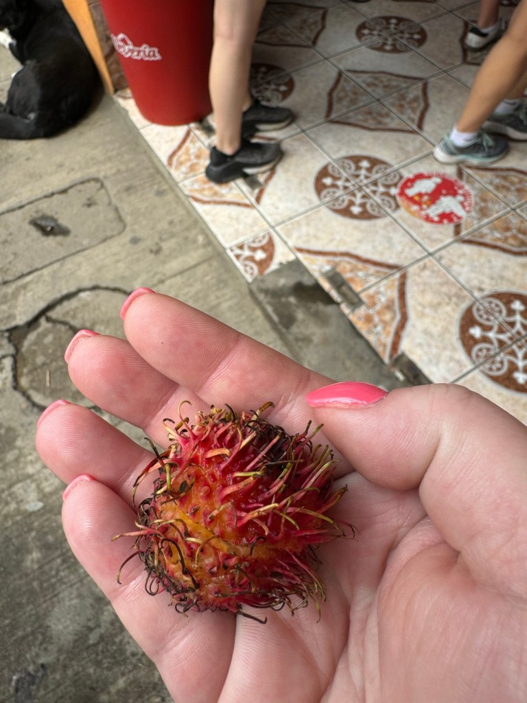 After we finished our roof project we had lot of time before we had to meet back up with the bus so we walked through the farmers market with our group. Elvis (our interpreter) bought us some lychee fruit to try. To eat it you tear off the outer skin and eat the inside (avoiding the seed) – it had kind of a grape like texture and is pretty sweet. we also had time to get ice cream (I got a coffee flavored one, and it was amazing!)