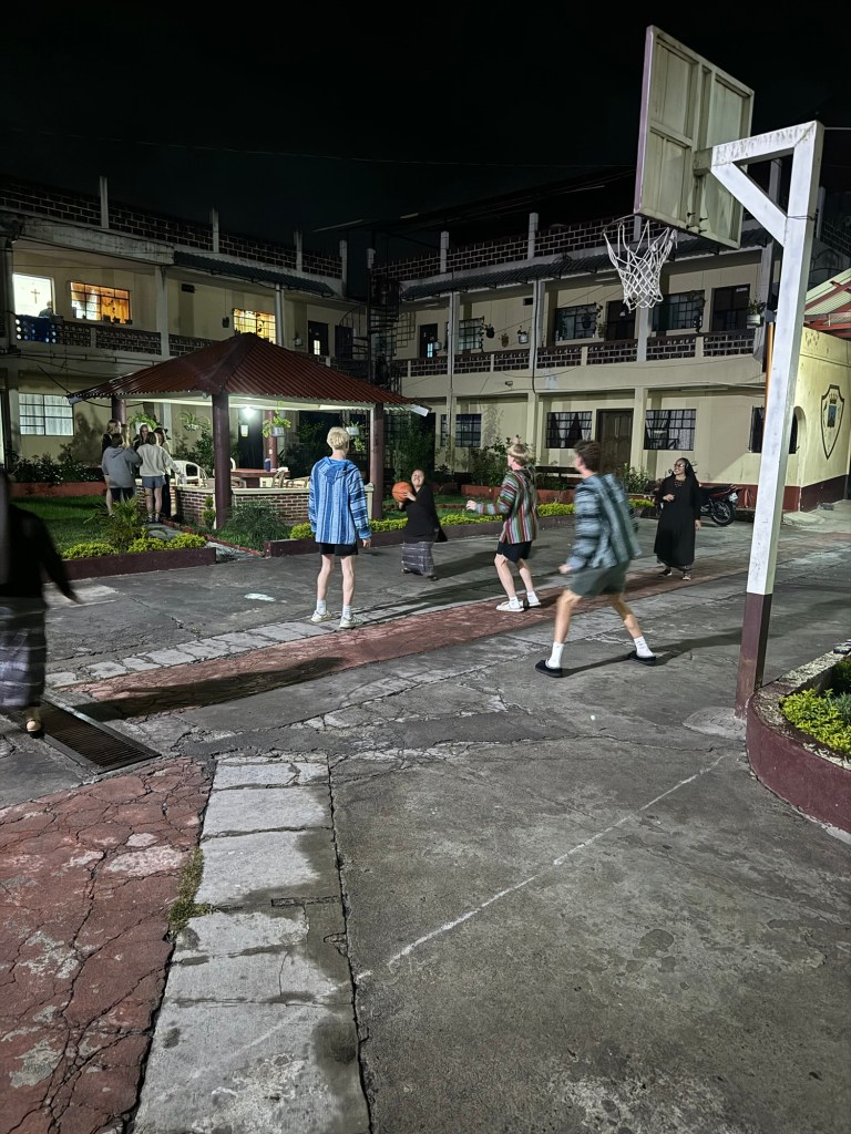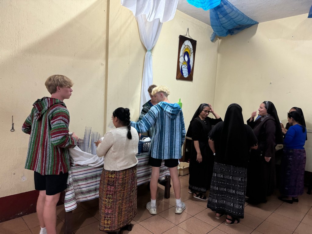 After the soccer game we walked back to the convent and had a chance to shower before dinner. For dinner tonight we ordered Domino’s pizza and the sisters all joined us. They all introduced themselves and shared a bit about their community. Then Fr. Mark shared a bit about Fr. Stanley Rother (I’ll share more of is story tomorrow as it pertains to the place we are going). Then we sang Happy Birthday to Andrew (one of the teens) who turned 17 today. All of the sisters and Guatemalans sang to him and it was probably the longest happy birthday song I have ever heard, it was awesome! After we all got cake and we started watching Encanto (one of my favorites) because the sisters had never seen it and specifically requested it. It was fun hearing them all giggle throughout the movie.