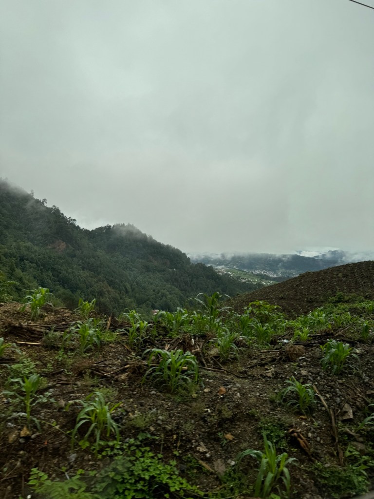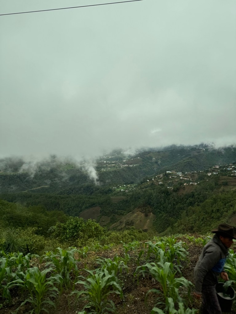 This morning started earlier than normal with a simple breakfast (just bread, cereal and coffee) at 5:40am and we loaded the bus at 6am to start driving to Lake Atitlán. It is about a two hour drive through the windy roads of the mountains to get there. I tried to sleep on the bus, but I wasn’t able to fall asleep. I did get a few cool pictures of the landscape as we drove there though.