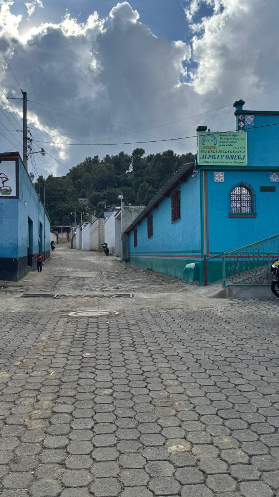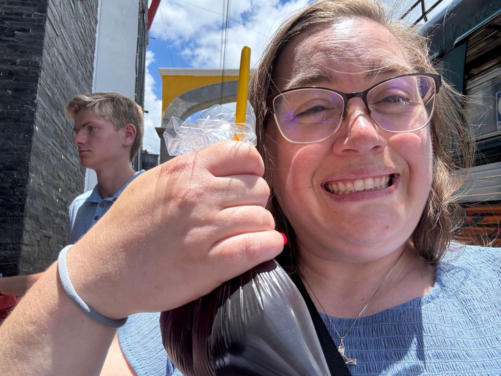 After Mass we walked back to the convent and on the way we stopped to take a group photo at the San Andres welcome sign and then popped into a corner store for drinks and snacks. I got a Gatorade, but it came in a glass bottle and so since they recycle the bottles they just pour it into a bag and give you a straw so that you don’t have to bring the bottle back or drink it right there in the store!